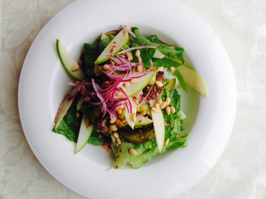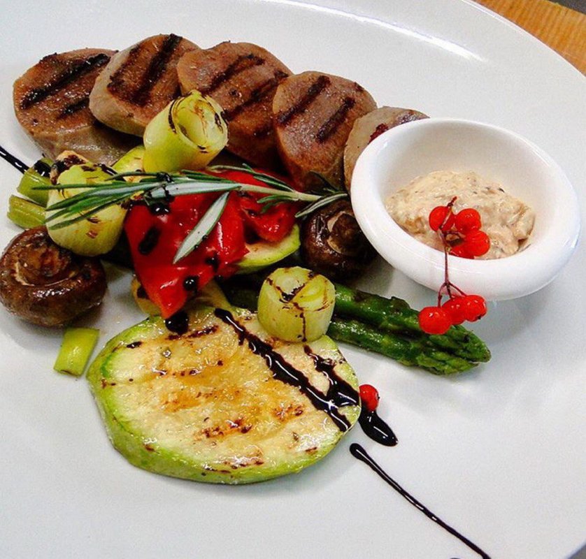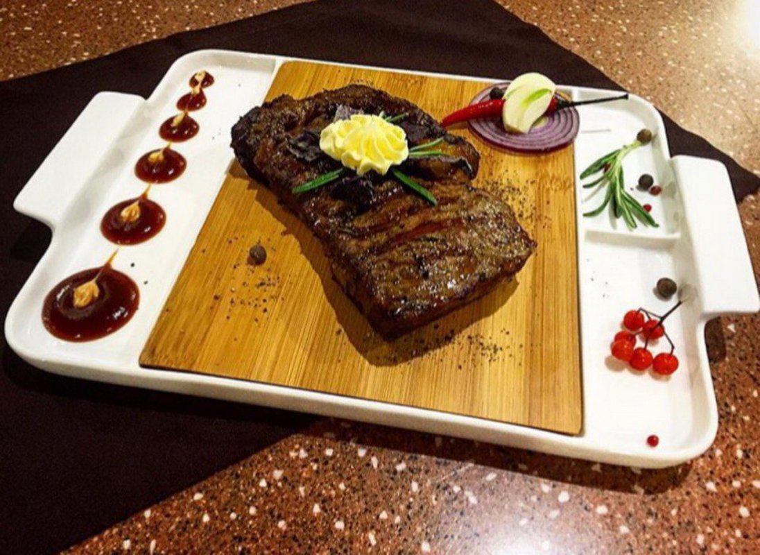 В кафе мы приходили на обед, блюда были большие и вкусные. Мы заказывали салат с сельдереем и говядиной, салат с печенью, язык с овощами на мангале и шашлык, а на десерт брали очень вкусные штрудель. Обстановка и атмосфера заведения мне понравились, всё чисто. У нас был предзаказ, сотрудники приветливо встретили, проводили и посадили.